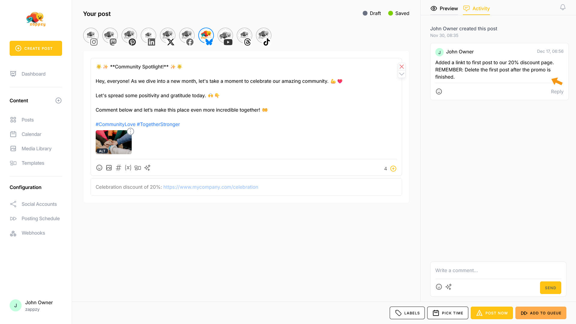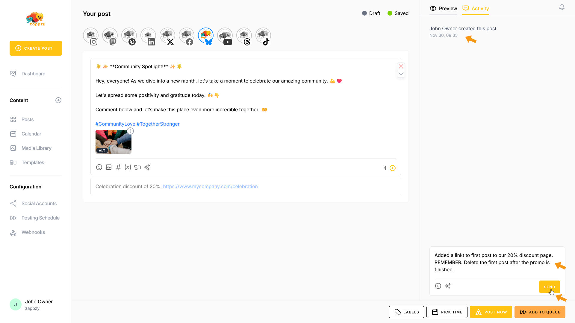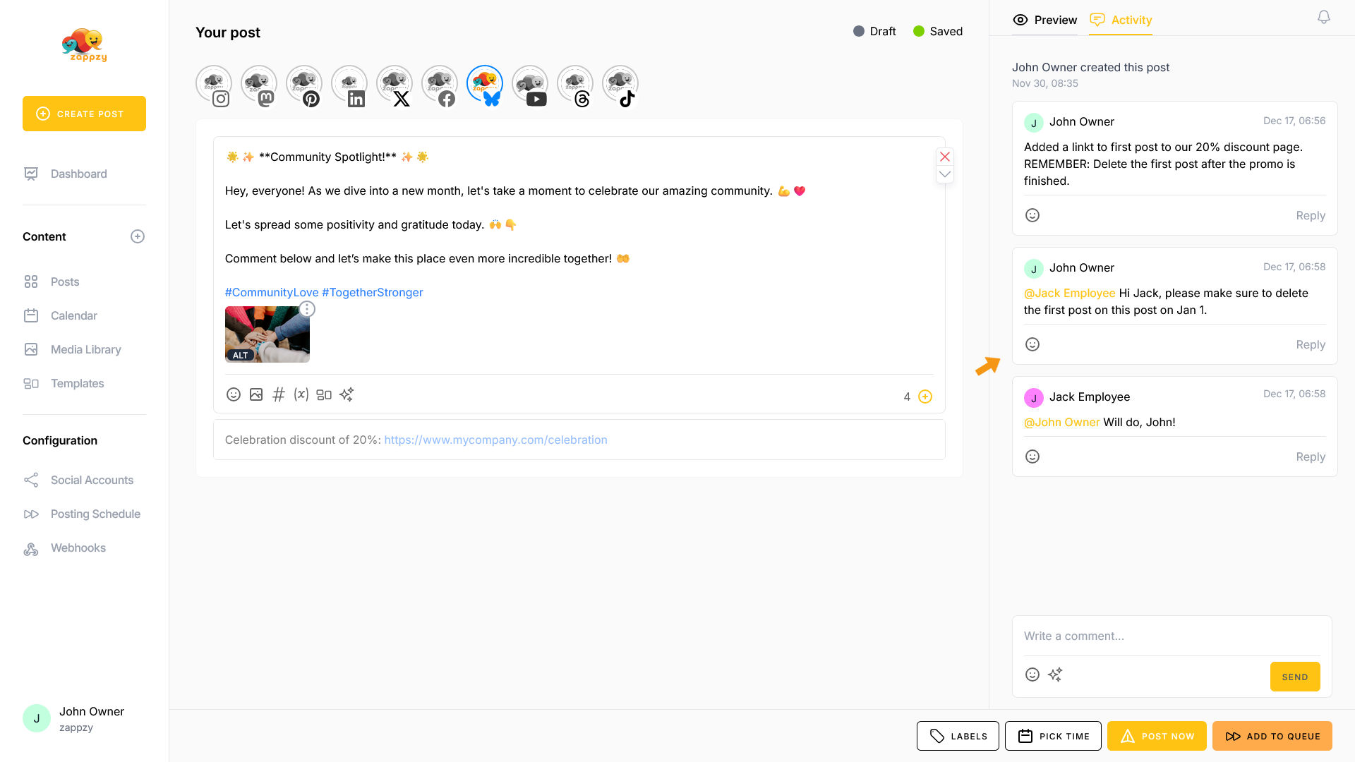 If you have the zappzy BUSINESS plan, the Activity tab is available to all team members. You can communicate with each other, leave feedback, and manage approvals—as explained in the article Approval: How to approve posts.