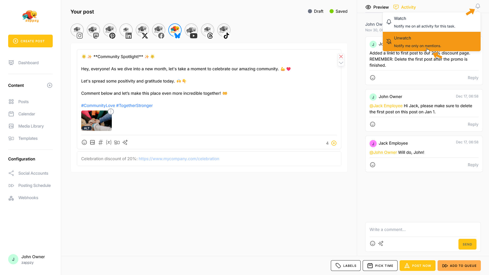 One last feature: at the top right, you'll see the bell icon. Here you can choose whether you want to be notified for all activity on this post or only when you're mentioned. This feature is especially useful for zappzy BUSINESS plan users.