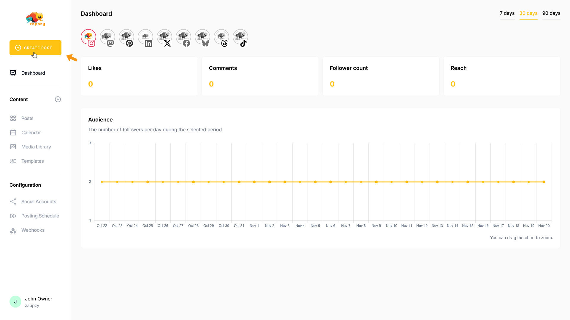 Once you're logged in to zappzy, you'll see an orange CREATE POST button in the left menu. Click on it.