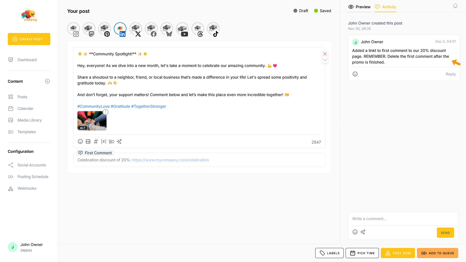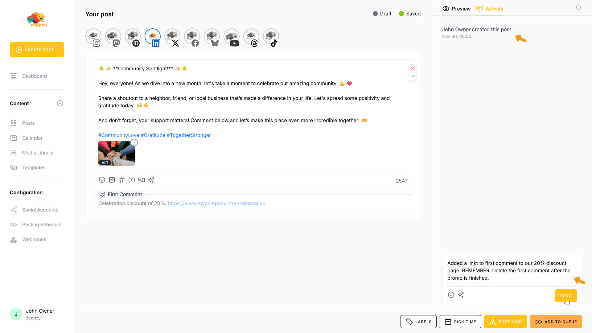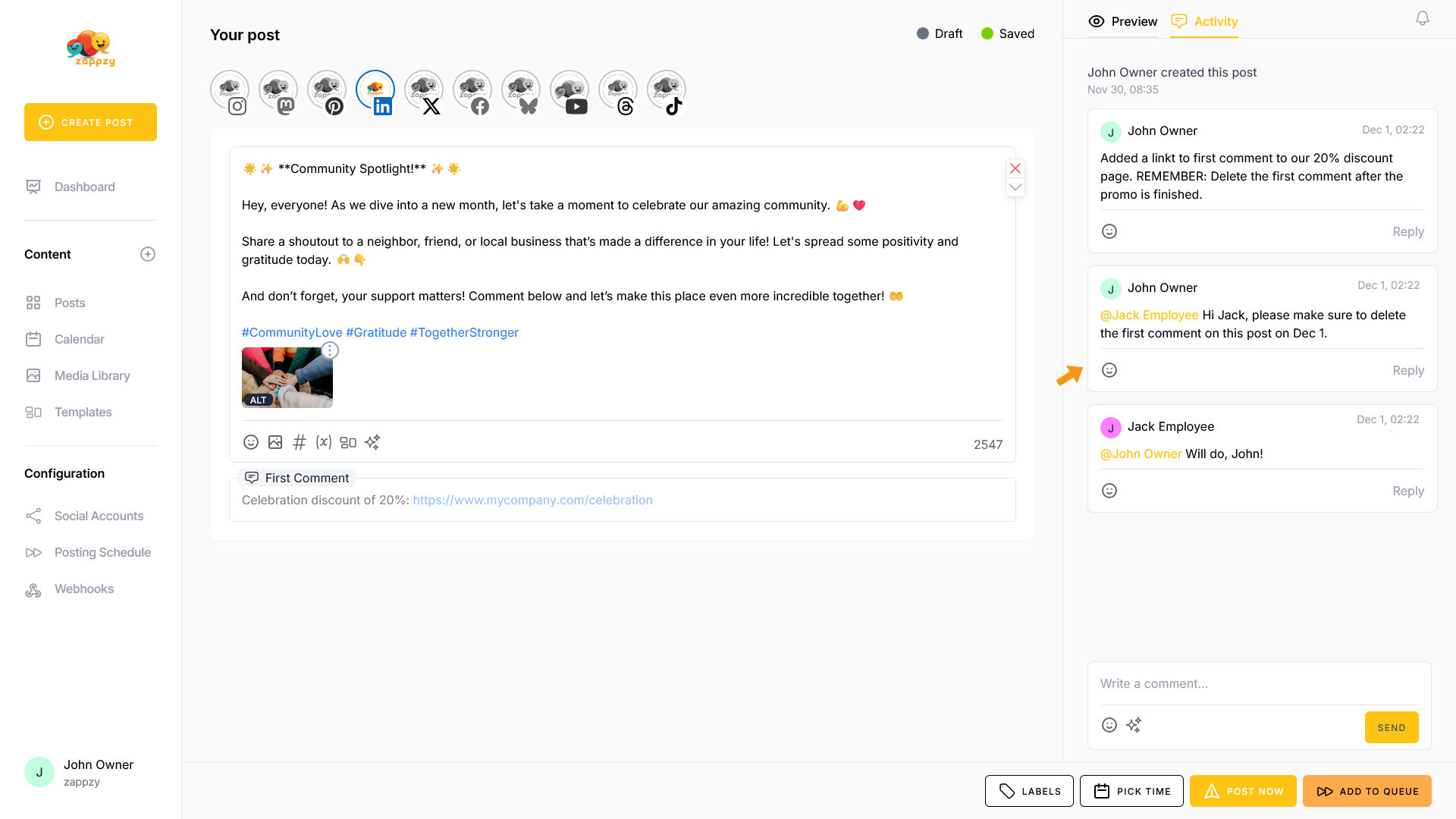 If you have the zappzy BUSINESS plan, the Activity tab is available to all team members. You can communicate with each other, leave feedback, and manage approvals—as explained in the article Approval: How to approve posts.