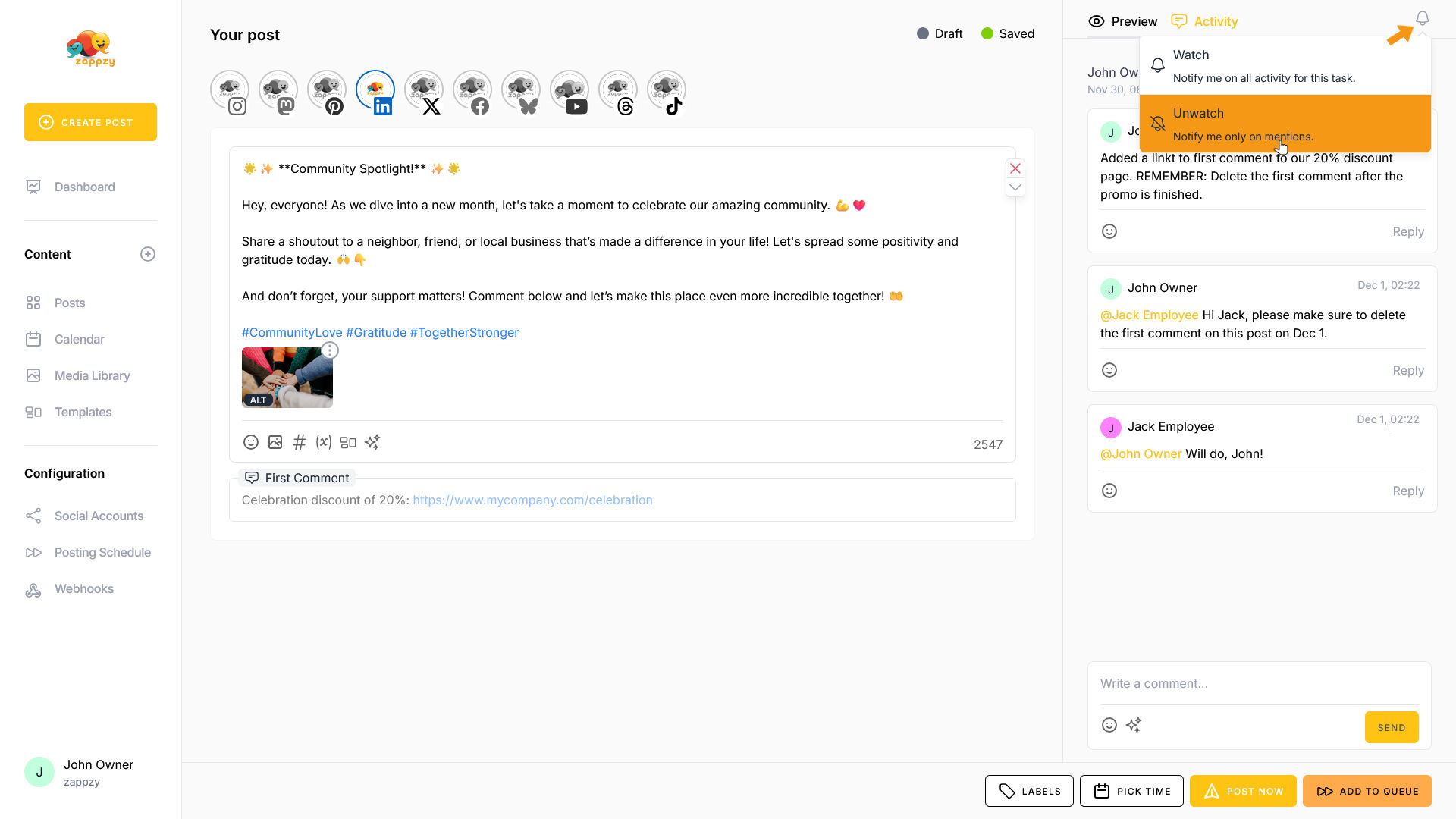 One last feature: at the top right, you'll see the bell icon. Here you can choose whether you want to be notified for all activity on this post or only when you're mentioned. This feature is especially useful for zappzy BUSINESS plan users.